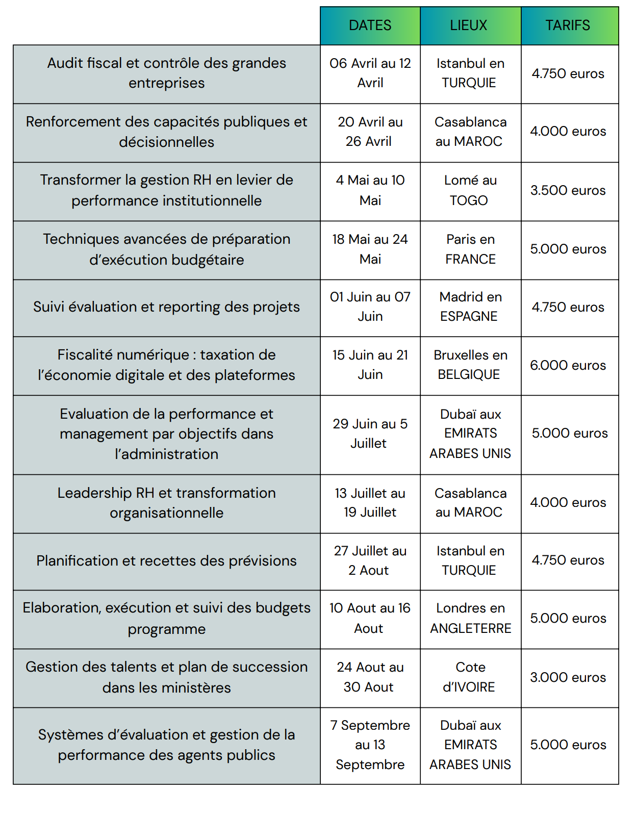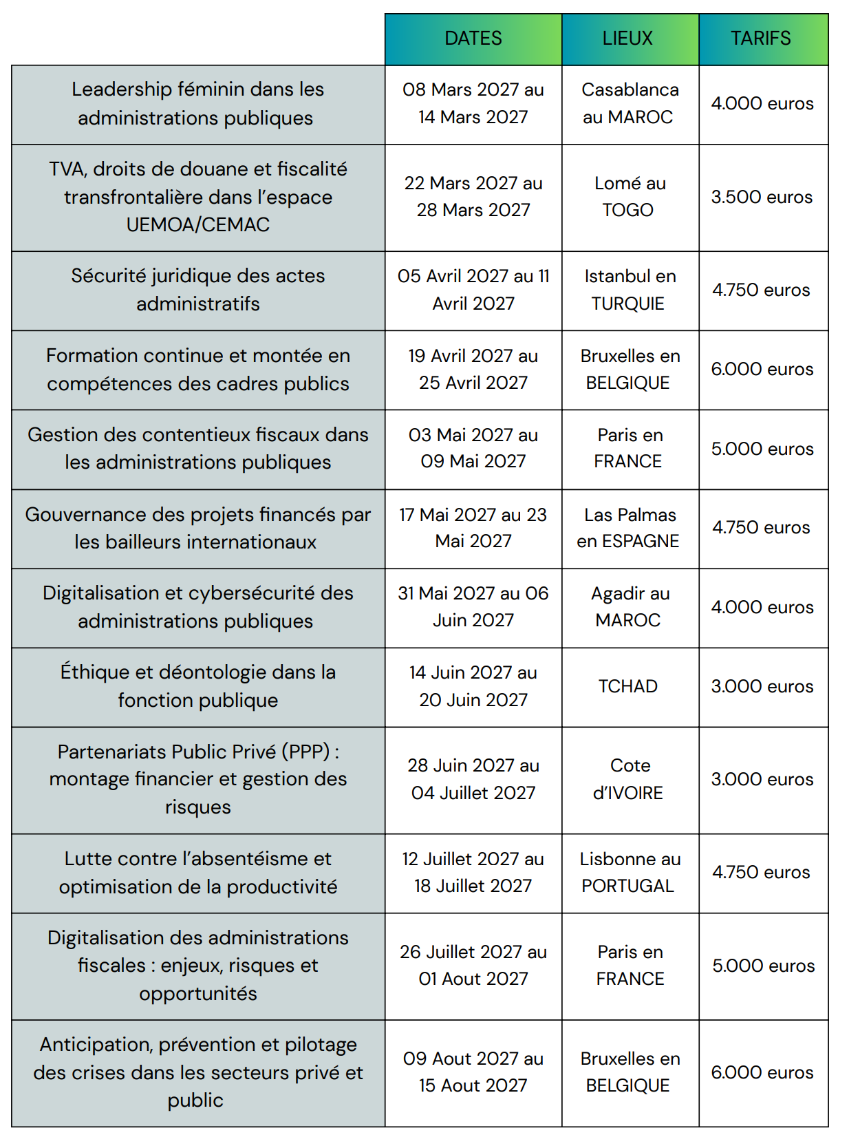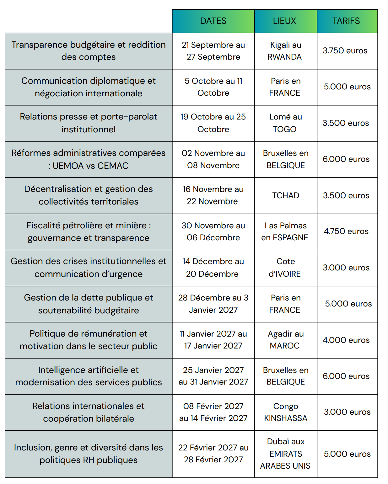 Nos interventions visent ainsi à renforcer les capacités stratégiques des décideurs, accompagner les transformations institutionnelles et développer des compétences immédiatement mobilisables.